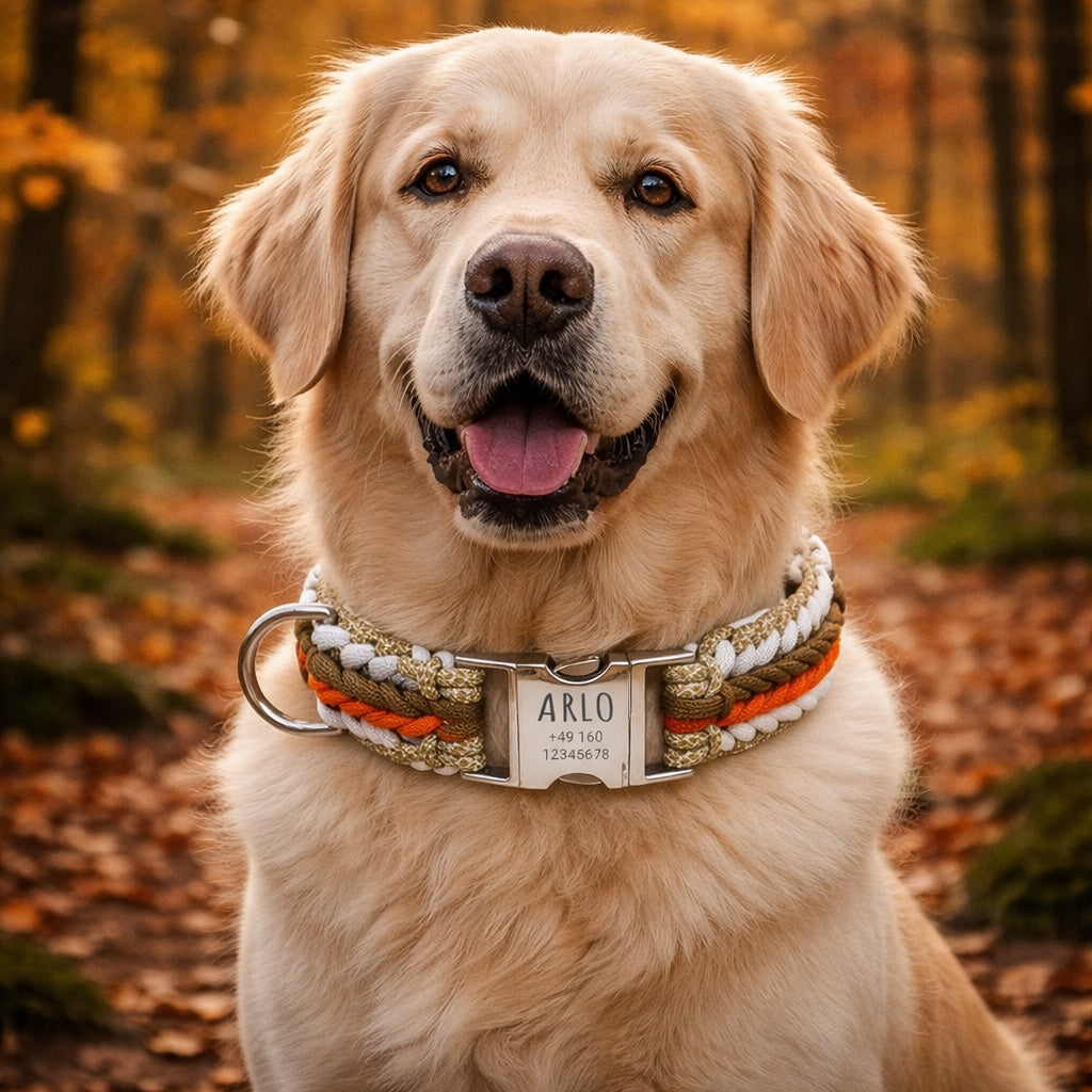 Hurraa - Arlo tulee! 🎉 Eloisa, vankka ja rakkaudella käsin solmittu paracord-kaulus, joka pistää heti silmään. Arlo on valmistettu 6 paracord-narusta, joiden värit ovat oranssi, ruskea, valkoinen ja beige, ja se tarjoaa tyyliä, mukavuutta ja turvallisuutta jokaiselle kävelylle.