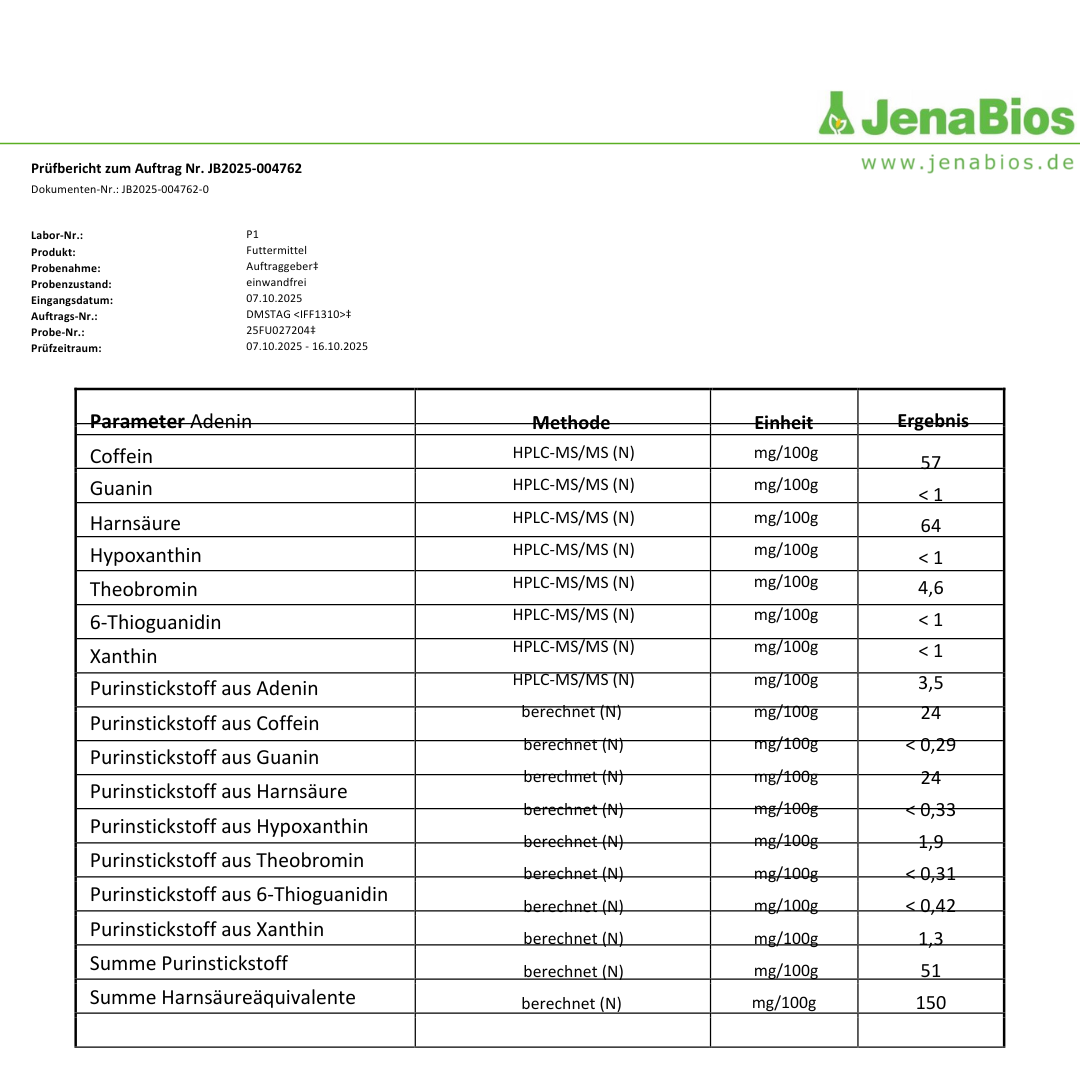 ✔ PURINARM & GETREIDEFREI: Unser Futter wurde im Oktober 2025 durch ein unabhängiges, nach HPLC-MS/MS-Verfahren arbeitendes Labor (JenaBios GmbH) auf seinen Purin- und Harnsäuregehalt geprüft.